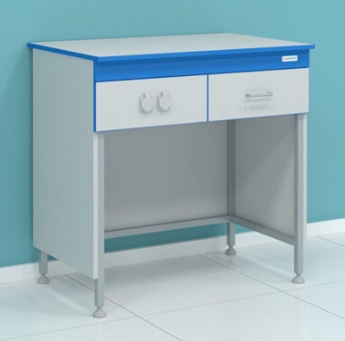 Столы предназначены для рутинных лабораторных исследований, экспериментов и анализов. Каркас выполнен из металлического профиля 25х25х1,5, окрашенного порошковой краской серого цвета. Опоры имеют регуляторы уровня высоты для компенсации неровности пола. Рабочая поверхность поставляется на выбор. Корпус выполнен из влагостойкой ЛДСП толщиной 16 мм (цвет — серый). Торцы всех поверхностей обработаны кромкой ПВХ синего цвета (2 мм). Стандартный цвет изделия — белый, серый. Столы поставляются в собранном виде. По запросу могут комплектоваться надстройками. Столешницы из HPL 16 мм изготавливаются БЕЗ кромки ПВХ по периметру, выполняется фрезеровка края. Под столешницей размещены выдвижные ящики на шариковых направляющих полного выдвижения и панель с установленными на ней двумя брызгозащитными розетками 220 В. Ручки - скоба металлическая 96 мм.